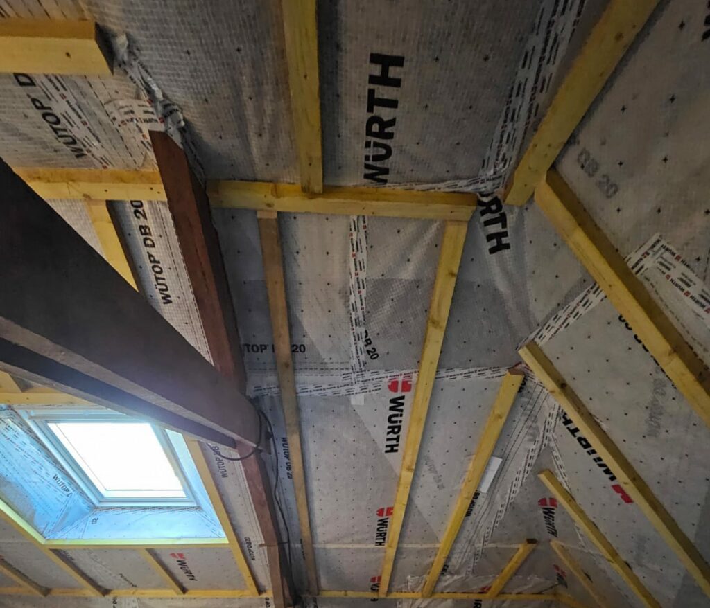 Un solivage pourra être créé pour réduire le volume chauffé et maximiser l’efficacité énergétique. Pour éviter la condensation, nous installerons un pare-vapeur adapté sur la charpente, renforçant l’étanchéité à l’air et les performances thermiques.